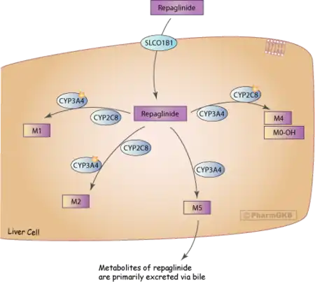 Metabolism: repaglinide is primarily metabolized by the liver - specifically CYP450 2C8 and 3A4 - and to a lesser extent via glucuronidation. Metabolites of repaglinide are inactive and do not display glucose-lowering effects.