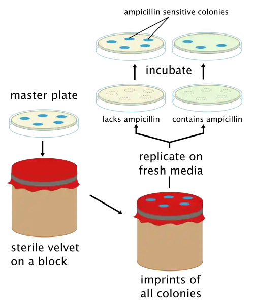 - ↑ Lederberg, J and Lederberg, EM (1952) Replica plating and indirect selection of bacterial mutants. J Bacteriol. 63: 399–406. (Full text)