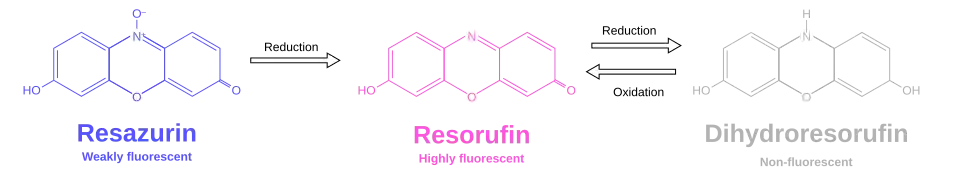 Resazurin is reduced to resorufin by aerobic respiration of metabolically active cells, and it can be used as an indicator of cell viability. It was first used to quantify bacterial content in milk by Pesch and Simmert in 1929.[8] It can be used to detect the presence of viable cells in mammalian cell cultures.[9] It was introduced commercially initially under Alamar Blue trademark (Trek Diagnostic Systems, Inc), and now also available under other names such as AB assay, Vybrant (Molecular Probes) and UptiBlue (Interchim).