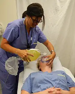 | A healthcare provider demonstrating manual ventilation via bag-valve mask on a colleague.[1] | |