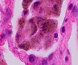 1. 1 2 3 4 5 William Perry, M.D., M.P.H., Kristine Konopka, M.D. "Respiratory bronchiolitis". Pathology Outlines.{{cite web}}: CS1 maint: multiple names: authors list (link) Topic Completed: 1 July 2020. Minor changes: 1 July 2020