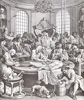 Some aspects of the popular view of dissection were exemplified by the final panel of William Hogarth's The Four Stages of Cruelty, a series of engravings that depict a felon's journey to the anatomical theatre.[60] The chief surgeon (John Freke)[61] appears as a magistrate, watching over the examination of the murderer Tom Nero's body by the Company of Surgeons. According to author Fiona Haslam, the scene reflects a popular view that surgeons were "on the whole, disreputable, insensitive to human suffering and prone to victimis[ing] people in the same way that criminals victimised their prey."[62] Another popular belief alluded to by Hogarth was that surgeons were so ignorant of the respect due to their subjects, that they allowed the remains to become offal. In reality, the rough treatment exacted by body snatchers on corpses continued on the premises they delivered to. Joshua Brookes once admitted that he had kicked a corpse in a sack down a flight of stairs,[63] while Robert Christison complained of the "shocking indecency without any qualifying wit" demonstrated by a male lecturer who dissected a woman.[64] Pranks were also common; a London student who jokingly dropped an amputated leg down a household chimney, into a housewife's stewpot, caused a riot.[65]