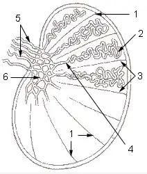 ![]() 1: Testicular septa 2: Convoluted seminiferous tubules 3: Testicular lobules 4: Straight seminiferous tubules 5: Efferent ductules 6: Rete testis | |