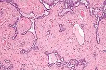 Micrograph of the rete testis involved by seminoma. H&E stain.