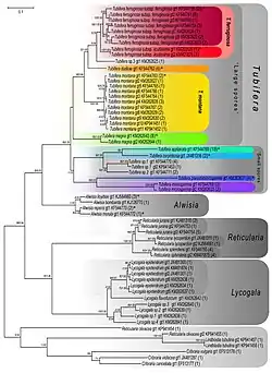 However, other classifications place Dictydiaethalium in the family Dictydiaethaliaceae and the other genera above in the family Tubiferaceae.[2]
