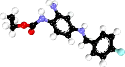 Retigabine (INN) or ezogabine (USAN) is an anticonvulsant used as an adjunctive treatment for partial epilepsies in treatment-experienced adult patients.[2] The drug was developed by Valeant Pharmaceuticals and GlaxoSmithKline. It was approved by the European Medicines Agency under the trade name Trobalt on March 28, 2011, and by the United States Food and Drug Administration (FDA), under the trade name Potiga, on June 10, 2011. Production was discontinued in June 2017.[3][4]