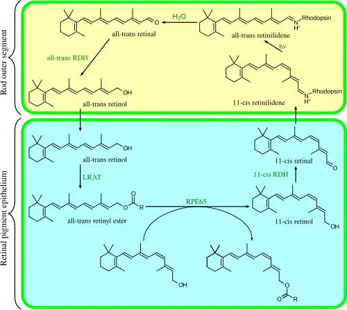 - ↑ Moiseyev, Gennadiy; Chen, Ying; Takahashi, Yusuke; Wu, Bill X.; Ma, Jian-xing (2005). "RPE65 is the isomerohydrolase in the retinoid visual cycle". Proceedings of the National Academy of Sciences. 102 (35): 12413–12418. Bibcode:2005PNAS..10212413M. doi:10.1073/pnas.0503460102. PMC 1194921. PMID 16116091.