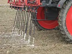 Applying urine as fertilizer has been called "closing the cycle of agricultural nutrient flows" or ecological sanitation or ecosan. Urine fertilizer is usually applied diluted with water because undiluted urine can chemically burn the leaves or roots of some plants, causing plant injury,[19] particularly if the soil moisture content is low. The dilution also helps to reduce odor development following application. When diluted with water (at a 1:5 ratio for container-grown annual crops with fresh growing medium each season or a 1:8 ratio for more general use), it can be applied directly to soil as a fertilizer.[20][21] The fertilization effect of urine has been found to be comparable to that of commercial nitrogen fertilizers.[22][23] Urine may contain pharmaceutical residues (environmental persistent pharmaceutical pollutants).[24] Concentrations of heavy metals such as lead, mercury, and cadmium, commonly found in sewage sludge, are much lower in urine.[25]