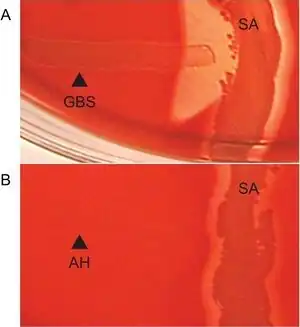 The CAMP test can be used to identify Streptococcus agalactiae. Though not strongly beta-hemolytic on its own,[6] group B strep presents with wedge-shaped colonies in the presence of Staphylococcus aureus.[7]