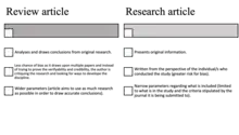 - ↑ 17.0 17.1 17.2 "What's the difference between a research article and a review article? - LibAnswers". jwu-ri.libanswers.com. Archived from the original on 2022-09-29. Retrieved 2022-05-10. Archived 2022-09-29 at the Wayback Machine