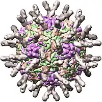 VP1, VP2, and VP3 form the major part of the protein capsid. The much smaller VP4 protein has a more extended structure, and lies at the interface between the capsid and the RNA genome, there are 60 copies of each of these proteins assembled as an icosahedron. Antibodies are a major defense against infection with the epitopes lying on the exterior regions of VP1-VP3.[20][21][25][26]