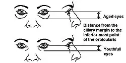 A facelift is performed to rejuvenate the appearance of the face. Aging of the face is most shown by a change in position of the deep anatomical structures, notably the platysma muscle, cheek fat and the orbicularis oculi muscle.[11] These lead up to three landmarks namely, an appearance of the jowl (a broken jaw line by ptosis of the platysma muscle), increased redundancy of the nasolabial fold (caused by a descent of cheek fat) and the increased distance from the ciliary margin to the inferior-most point of the orbicularis oculi muscle (caused by decreasing tone of the orbicularis oculi muscle).[11] The skin is a fourth component in the aging of the face. The ideal age for face-lifting is at age 50 or younger, as measured by patient satisfaction.[12][13][14] Some areas, such as the nasolabial folds or marionette lines, in some cases can be treated more suitably with Botox or liposculpture.