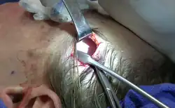 ![]() Temporal incision behind the hairline in endoscopic midface lift (rhytidectomy). Note the shiny surface of the deep temporal fascia. This plane is dissected down to the orbital rim and connected to the midface subperiosteal plane created through the sublabial incision under the upper lip, and often through a lower eyelid incision. | |