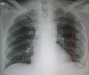 A rib fracture is a break in a rib bone.[1] This typically results in chest pain that is worse with breathing in.[1] Bruising may occur at the site of the break.[3] When several ribs are broken in several places a flail chest results.[4] Potential complications include a pneumothorax, pulmonary contusion, and pneumonia.[2][1]