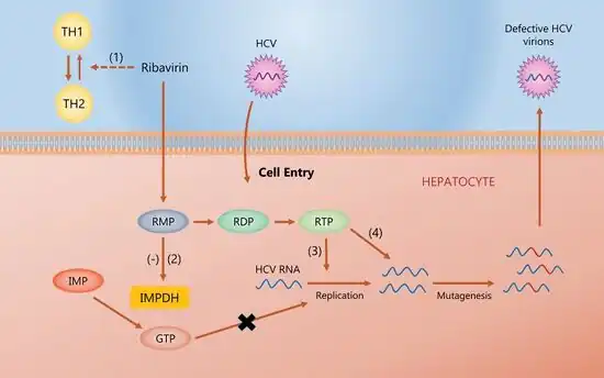 - ↑ Paeshuyse J, Dallmeier K, Neyts J (December 2011). "Ribavirin for the treatment of chronic hepatitis C virus infection: a review of the proposed mechanisms of action". Current Opinion in Virology. 1 (6): 590–8. doi:10.1016/j.coviro.2011.10.030. PMID 22440916.