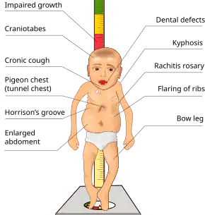 - ↑ 2.00 2.01 2.02 2.03 2.04 2.05 2.06 2.07 2.08 2.09 2.10 2.11 "Rickets, Vitamin D Deficiency". NORD (National Organization for Rare Disorders). 2005. Archived from the original on 4 October 2017. Retrieved 19 December 2017. Archived 4 October 2017 at the Wayback Machine