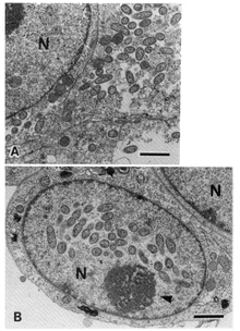 | a) Rickettsiae in cytoplasm of heavily infected Vero C1008 cells. b) Rickettsiae in a nucleus | |