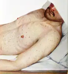 Rickettsia typhi is a causative agent of murine typhus (endemic typhus) in humans and is distributed worldwide.[30] It is an acute, febrile illness that is mainly transmitted by the fleas of rodents, commonly associated with cities and ports where urban rats (Rattus rattus and Rattus norvegicus) are abundant.[30] Humans acquire infection by inhalation or by self-inoculating infected fleas or flea feces into skin when they visit disease-endemic areas infested with rats.[18][31] Most patients present with a fever, and many have a rash and headache,[30] although it can also lead to disseminated, multisystem disease including infections of the brain, lung, liver, kidney, and heart endothelia.[32][33] As these signs and symptoms are similar to those produced by other diseases, including other rickettsiae, murine typhus is difficult to diagnose clinically.[31] In addition to non-uniform and non-specific symptoms, there is a lack of diagnostic tests effective during the acute stages of the illness, leading to delayed appropriate treatment.[1] Murine typhus may generally be clinically mild, but severe and even fatal cases have been reported.[20] The severity of murine typhus infection has been associated with age, race, and delayed diagnosis.[20] Doxycycline is the antibiotic of choice as it is shown to shorten the course of illness,[30] although 99% of those infected will clear the disease within weeks without specific treatment.[1]
