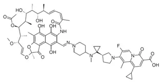 Rifaquizinone (RFQ, CBR-2092, TNP-2092) is an experimental antibiotic medication developed in China for the treatment of bacterial infections such as drug-resistant strains of Staphylococcus aureus. It is an orally active prodrug which is also a codrug, being cleaved inside the body to two active components, with half of the molecule being a rifamycin derivative, and the other half a quinolone antibiotic. It is in clinical trials for joint infections following surgery and acute bacterial skin and skin structure infections.[1][2][3][4]