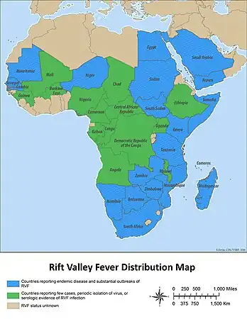 Outbreaks of the disease have only occurred in Africa and Arabia.[1] Outbreaks usually occur during periods of increased rain which increase the number of mosquitoes.[1] The disease was first reported among livestock in Rift Valley of Kenya in the early 1900s,[2] and the virus was first isolated in 1931.[1]