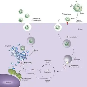 The virus belongs to the Bunyavirales order. This is an order of enveloped negative single stranded RNA viruses. All Bunyaviruses have an outer lipid envelope with two glycoproteins—G(N) and G(C)—required for cell entry. They deliver their genome into the host-cell cytoplasm by fusing their envelope with an endosomal membrane.[8][9][10]