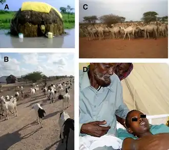 a) Persistent flooding b and c) susceptible livestock d) infected individual with severe meningismus