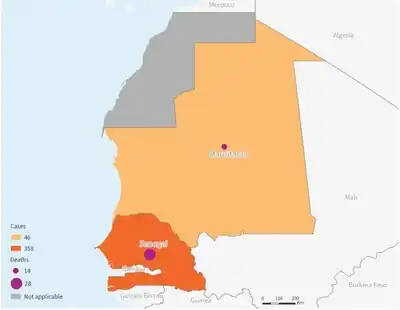 On 5 November the World Health Organization announced that national health authorities in Mauritania and Senegal reported 404 confirmed human cases of Rift Valley Fever including 42 deaths.[55]