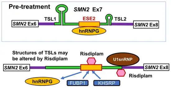 Nusinersen, the first drug approved to treat SMA, an anti-sense oligonucleotide targetting intronic splicing silencer N1 (ISS-N1), also alters mRNA splicing of SMN2.[17]