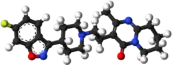 Risperidone has been classified as a "qualitatively atypical" antipsychotic agent with a relatively low incidence of extrapyramidal side effects (when given at low doses) that has more pronounced serotonin antagonism than dopamine antagonism. Risperidone contains the functional groups of benzisoxazole and piperidine as part of its molecular structure. Although not a butyrophenone, it was developed with the structures of benperidol and ketanserin as a basis. It has actions at several 5-HT (serotonin) receptor subtypes. These are 5-HT2C, linked to weight gain, 5-HT2A, linked to its antipsychotic action and relief of some of the extrapyramidal side effects experienced with the typical neuroleptics.[50]