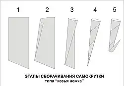 In Russia a special kind of self-rolled cigarette was in use, called "goat's leg" (Russian: козья ножка). A paper (commonly a newspaper paper) was rolled in a cone, which was bent in half in the middle and the wider part was filled with tobacco. In a way, it resembled a tobacco pipe.[7]
