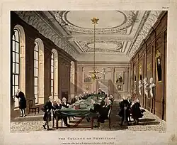 - ↑ "Royal College of Physicians, Warwick Lane, London: the interior of the Hall, during the examination of a candidate. Coloured aquatint by J. Bluck after T. Rowlandson and A. C. Pugin, 1808". Wellcome Collection. Retrieved 30 December 2018.