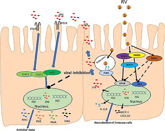 - ↑ Holloway G, Coulson BS (2013). "Innate cellular responses to rotavirus infection". The Journal of General Virology. 94 (6): 1151–60. doi:10.1099/vir.0.051276-0. PMID 23486667.