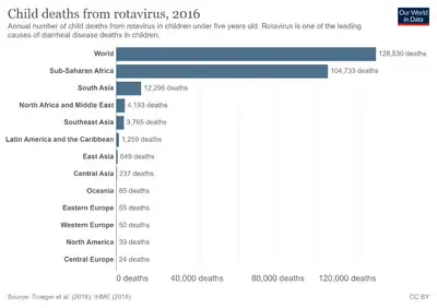 Rotaviral enteritis is usually an easily managed disease of childhood, but in 2013, rotaviruses caused 37 percent of deaths of children from diarrhoea and 215,000 deaths worldwide,[9] and almost two million more became severely ill.[7] Most of these deaths occurred in developing countries.[10] In the United States, before initiation of the rotavirus vaccination programme in the 2000s, rotavirus caused about 2.7 million cases of severe gastroenteritis in children, almost 60,000 hospitalisations, and around 37 deaths each year.[11] Following rotavirus vaccine introduction in the United States, hospitalisation rates have fallen significantly.[12][13] Public health campaigns to combat rotavirus focus on providing oral rehydration therapy for infected children and vaccination to prevent the disease.[14] The incidence and severity of rotavirus infections has declined significantly in countries that have added rotavirus vaccine to their routine childhood immunisation policies.[15][16][17]