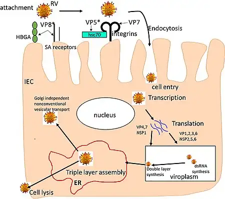 - ↑ Ruiz MC, Leon T, Diaz Y, Michelangeli F (2009). "Molecular biology of rotavirus entry and replication". TheScientificWorldJournal. 9: 1476–97. doi:10.1100/tsw.2009.158. PMC 5823125. PMID 20024520.