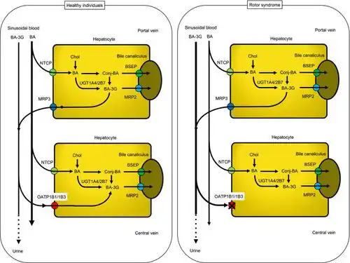 - ↑ van de Steeg E, Stránecký V, Hartmannová H, Nosková L, Hřebíček M, Wagenaar E, van Esch A, de Waart DR, Oude Elferink RP, Kenworthy KE, Sticová E, al-Edreesi M, Knisely AS, Kmoch S, Jirsa M, Schinkel AH (2012). "Complete OATP1B1 and OATP1B3 deficiency causes human Rotor syndrome by interrupting conjugated bilirubin reuptake into the liver". The Journal of Clinical Investigation. 122 (2): 519–28. doi:10.1172/JCI59526. PMC 3266790. PMID 22232210.