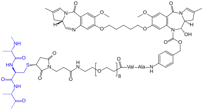 Chemical structure of "tesirine" (drawn in black). It consists of a pyrrolobenzodiazepine type dimer (top), which is the actual anti-cancer agent, a Val–Ala structure that can be cleaved by an enzyme to detach the anti-cancer agent from the antibody, a polyethylene glycol spacer, and a maleimide linker which is attached to a cysteine in the antibody's (rovalpituzumab's) peptide backbone, drawn blue. Each rovalpituzumab molecule has an average of two such attachments.[9]