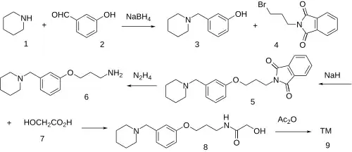 The reductive amination between piperidine (1) and 3-hydroxybenzaldehyde (2) gives 3-(1-piperidinylmethyl)phenol (3). Williamson ether synthesis with N-(3-bromopropyl)phthalimide (4) gives the intermediate 5. Deprotection with hydrazine yields (3-(1-piperidinylmethyl)phenoxy)propylamine (6). Heating with glycolic acid (7) provides roxatidine (8) which is then converted to its acetate ester, roxatidine acetate (9), by acetylation with acetic anhydride.
