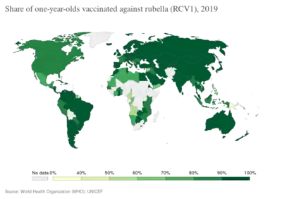 Rubella vaccine is a vaccine used to prevent rubella.[1] Effectiveness begins about two weeks after a single dose and around 95% of people become immune.[1] Countries with high rates of immunization no longer see cases of rubella or congenital rubella syndrome.[1] When there is a low level of childhood immunization in a population it is possible for rates of congenital rubella to increase as more women make it to child bearing age without either vaccination or exposure to the disease.[1] Therefore, it is important for more than 80% of people to be vaccinated.[1] By introducing rubella containing vaccines, rubella has been eradicated in 81 nations, as of mid-2020.[2]