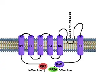 SK potassium channels share the same basic architecture with Shaker-like voltage-gated potassium channels.[11] Four subunits associate to form a tetramer. Each of the subunits has six transmembrane hydrophobic alpha helical domains (S1-S6). A loop between S5 and S6—called the P-loop—provides the pore-forming region that always faces the center of the channel.[12] Each of the subunits has six hydrophobic alpha helical domains that insert into the cell membrane. A loop between the fifth and sixth transmembrane domains forms the potassium ion selectivity filter. SK channels may assemble as homotetrameric channels or as heterotetrameric channels, consisting of more than one SK channel subtype. In addition, SK potassium channels are tightly associated with the protein calmodulin, which accounts for the calcium sensitivity of these channels.[11][13] Calmodulin participates as a subunit of the channel itself, bound to the cytoplasmic C-terminus region of the peptide called the calmodulin binding domain (CaMBD).[14]