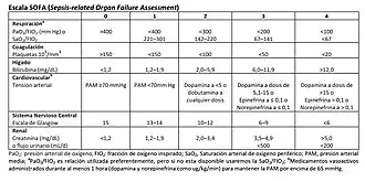 - ↑ Vincent JL, Moreno R, Takala J, Willatts S, De Mendonça A, Bruining H, Reinhart CK, Suter PM, Thijs LG (Jul 1996). "The SOFA (Sepsis-related Organ Failure Assessment) score to describe organ dysfunction/failure. On behalf of the Working Group on Sepsis-Related Problems of the European Society of Intensive Care Medicine". Intensive Care Med. 22 (7): 707–10. doi:10.1007/bf01709751. PMID 8844239. S2CID 40396839.