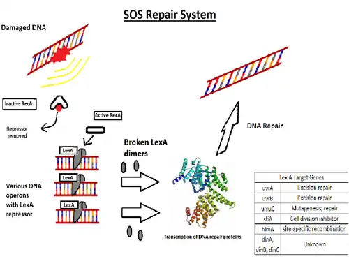 The SOS response is a global transcriptional response to DNA damage in prokaryotes, in which the cell cycle is arrested and DNA repair mechanisms (error-free as well as error-prone) are induced. The regulation of this response is driven by two proteins, RecA and LexA. The RecA protein, stimulated by single-stranded DNA, is involved in the inactivation of the repressor (LexA) of SOS response genes thereby inducing the response. It is an error-prone repair system that contributes significantly to DNA changes observed in a wide range of bacterial species.