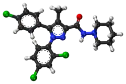 Rimonabant (also known as SR141716; trade names Acomplia, Zimulti)[3] is an anorectic antiobesity drug approved in Europe in 2006 but was withdrawn worldwide in 2008 due to serious psychiatric side effects; it was never approved in the United States.[1][2] Rimonabant is an inverse agonist for the cannabinoid receptor CB1 and was first-in-class for clinical development.[4][5]
