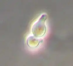 Saccharomyces cerevisiae (/ˌsɛrəˈvɪsi./) (brewer's yeast or baker's yeast) is a species of yeast (single-celled fungal microorganisms). The species has been instrumental in winemaking, baking, and brewing since ancient times. It is believed to have been originally isolated from the skin of grapes.[a] It is one of the most intensively studied eukaryotic model organisms in molecular and cell biology, much like Escherichia coli as the model bacterium. It is the microorganism which causes many common types of fermentation. S. cerevisiae cells are round to ovoid, 5–10 μm in diameter. It reproduces by budding.[1]