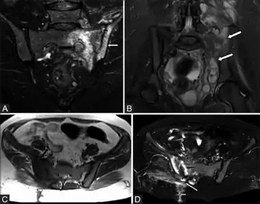 - ↑ Scott, Kevin R.; Rising, Kristin L.; Conlon, Lauren Weinberger (2014). "Infectious Sacroiliitis". The Journal of Emergency Medicine. 47 (3): e83 – e84. doi:10.1016/j.jemermed.2014.05.001. PMID 24950942.