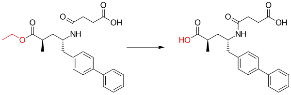 Sacubitril is a prodrug that is activated to sacubitrilat (LBQ657) by de-ethylation via esterases.[2] Sacubitrilat inhibits the enzyme neprilysin,[3] which is responsible for the degradation of atrial and brain natriuretic peptide, two blood pressure–lowering peptides that work mainly by reducing blood volume.[4] In addition, neprilysin degrades a variety of peptides including bradykinin,[5] an inflammatory mediator.