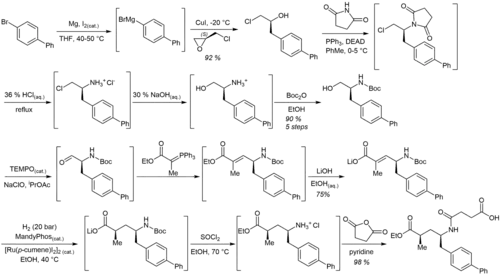 The large scale synthesis of sacubritil begins with 4-bromo-1,1'-biphenyl, which is converted to its corresponding Grignard reagent; this is reacted directly with (S)-epichlorohydrin regioselectively at less-substituted site of the epoxide.[6][7]