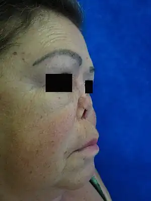 Lateral view of the face with a saddle nose deformity far up on the bridge due to granulomatosis with polyangiitis from using a nasal prosthesis