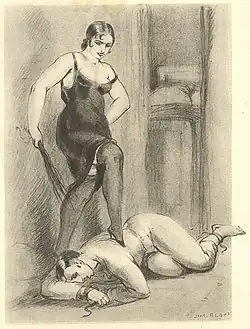 Sadomasochism has been practiced since ancient times with some scholars suggesting that it is an integral part of human culture.[11] Some propose that it was already present among non-human primate and primitive human communities before emerging in ancient cultures.[12] One of the oldest surviving narratives citing its practice is an Egyptian love song, sung by a man expressing a desire to be subjugated by a woman so he could experience pleasure as she treats him like a slave.[2] Roman historian Juvenal described a case of a woman who submitted herself to the whipping and beating of the followers of Pan.[13]