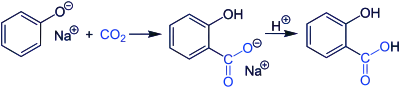 Sodium salicylate is commercially prepared by treating sodium phenolate (the sodium salt of phenol) with carbon dioxide at high pressure (100 atm) and high temperature (115 °C) – a method known as the Kolbe-Schmitt reaction. Acidification of the product with sulfuric acid gives salicylic acid: