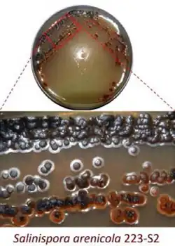 Salinispora is a genus of obligately aerobic, gram-positive, non-acid-fast bacteria belonging to the family of Micromonosporaceae. They are heterotrophic, non-motile, and obligately grow under high osmotic/ionic-strength conditions.[2][3][4] They are the first identified genus of gram-positive bacteria which has a high osmotic/ionic-strength requirement for survival.[2] They are widely abundant in tropical marine sediments and were first identified in 2002.[2] This genus of bacteria has potential biotechnological significance due to their production of novel secondary metabolites which can be used pharmaceutically.[5]